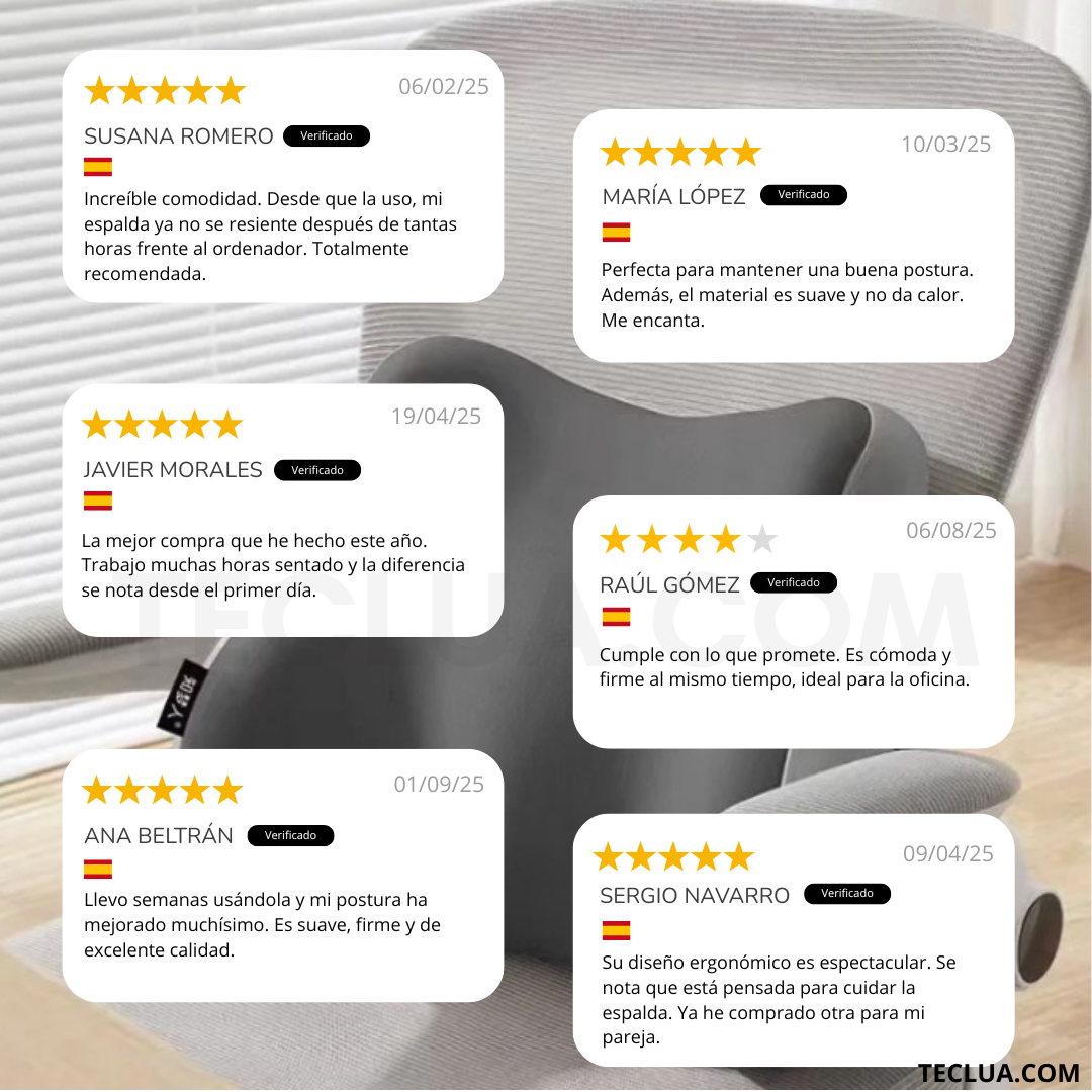 Tu espalda merece el mismo descanso que tú. El cojín lumbar Teclua ha sido diseñado para ofrecer soporte ergonómico y alivio constante, adaptándose a la forma natural de la columna. Su diseño envolvente favorece una postura saludable y reduce la tensión acumulada durante las largas horas de trabajo o estudio.